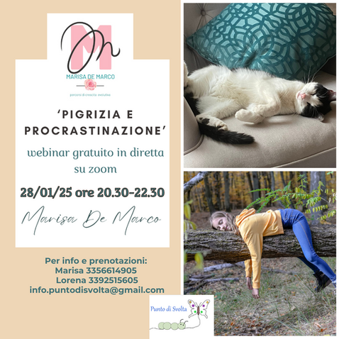 Vuoi rimanere in contatto con me e ricevere gli aggiornamenti del Blog e dei miei prossimi eventi?Lascia la tua e-mail e riceverai in omaggio il mio e-Book "Procrastinazione e pigrizia" e se vorrai una prima sessione gratuita di 30 minuti